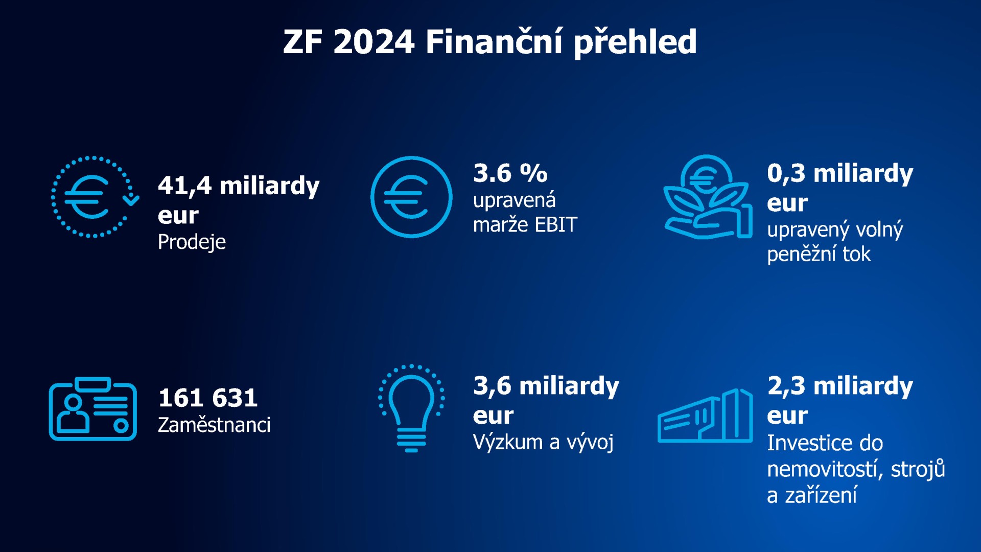 V roce 2024 dosáhla společnost ZF obratu zhruba 41,4 miliardy eur a zaměstnávala přibližně 161 600 zaměstnanců po celém světě. Společnost je zastoupena ve 161 výrobních závodech v 30 zemích.