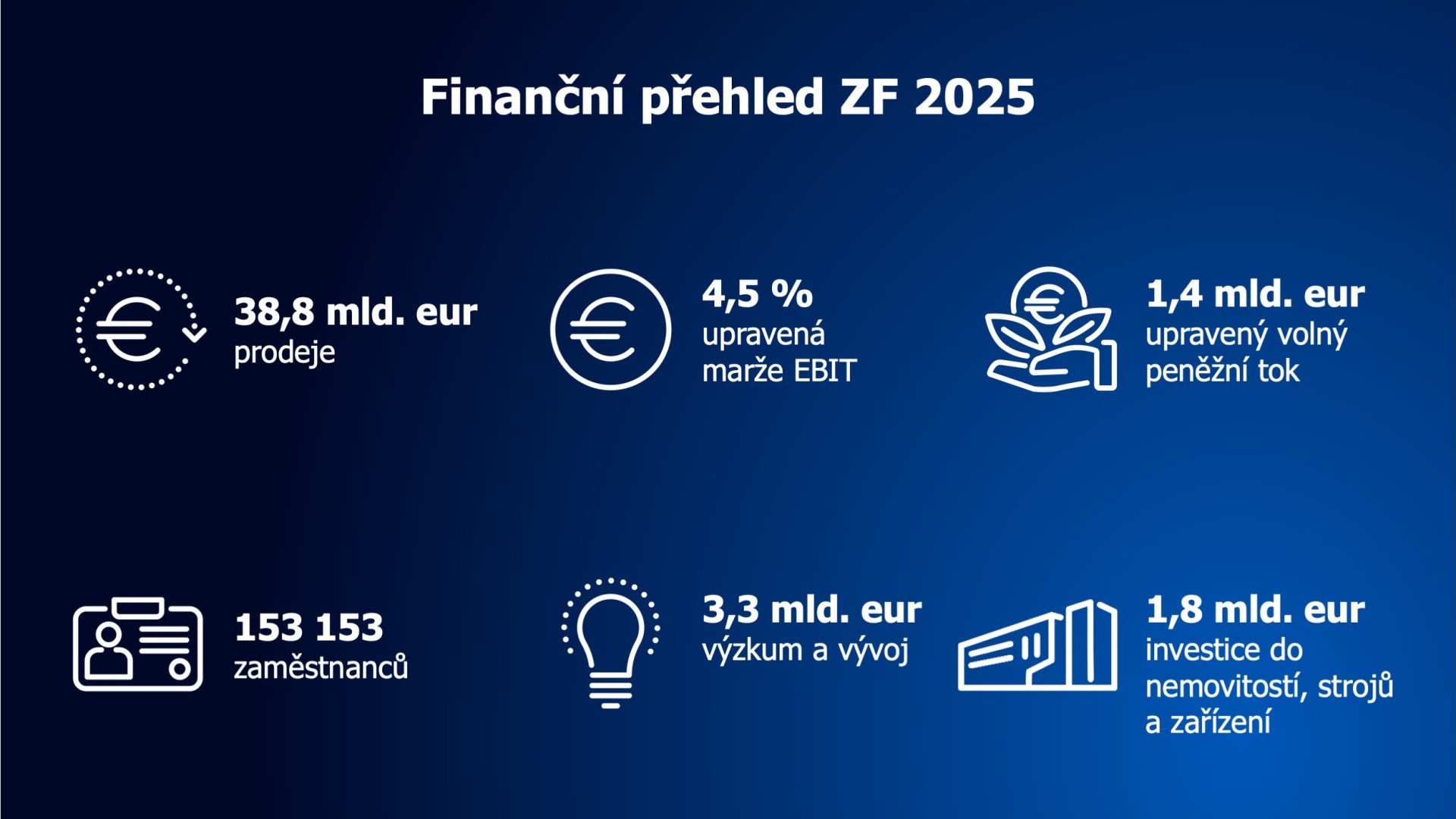 V roce 2025 dosáhla společnost ZF obratu zhruba 38,8 miliardy eur a zaměstnávala přibližně 153 000 zaměstnanců po celém světě. Společnost je zastoupena ve 162 výrobních závodech v 29 zemích.