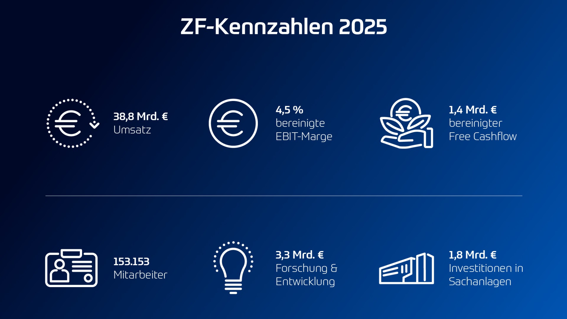 Im Jahr 2025 hat ZF mit weltweit rund 153.000 Mitarbeitern einen Umsatz von 38,8 Milliarden Euro erzielt. Das Unternehmen ist an 162 Produktionsstandorten in 29 Ländern vertreten.