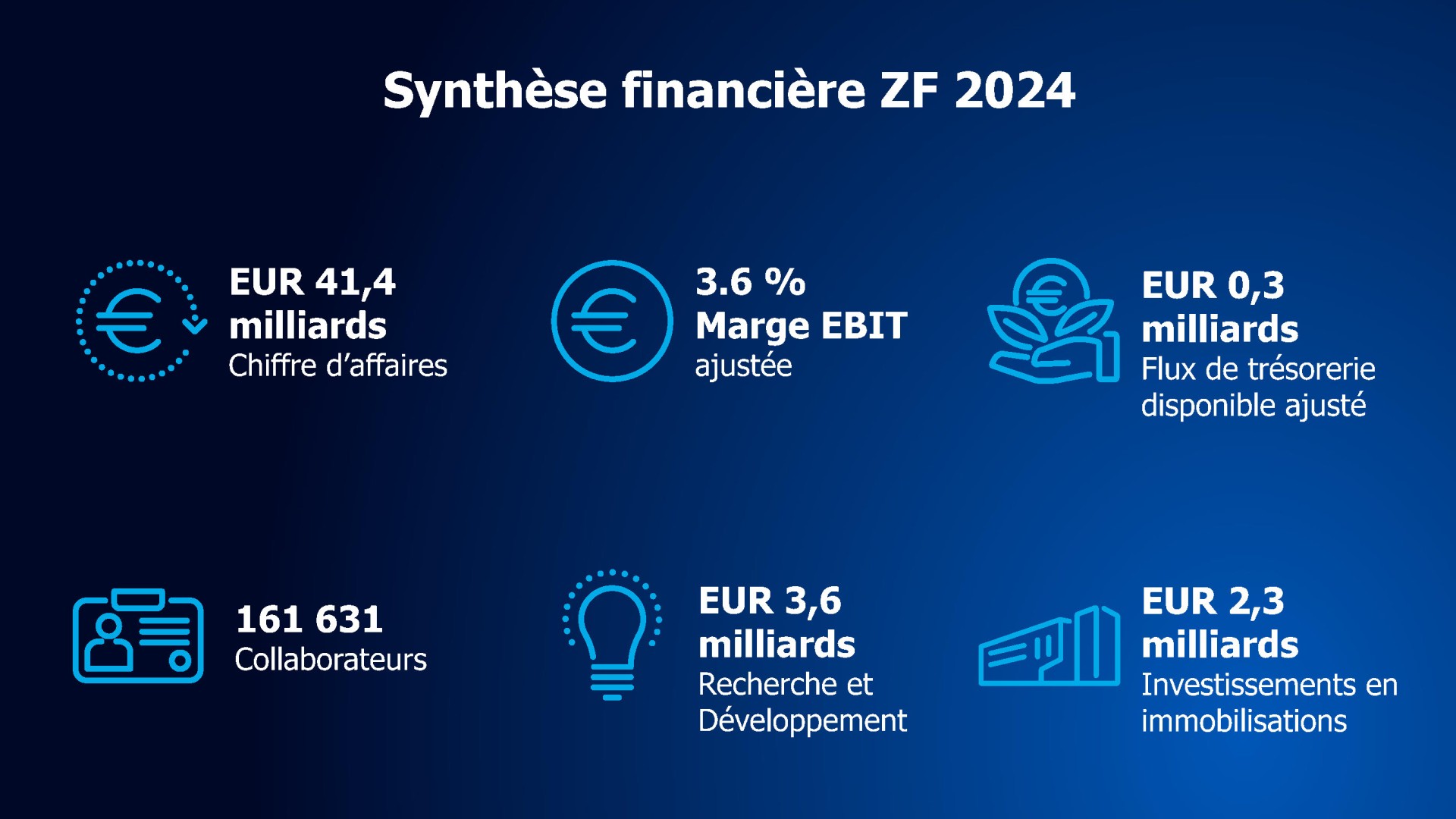 Totalisant environ 161 600 collaborateurs à travers le monde, ZF a réalisé un chiffre d’affaires de 41,4 milliards d’euros au cours de l’exercice 2024. La société exploite 161 sites de production dans 30 pays.