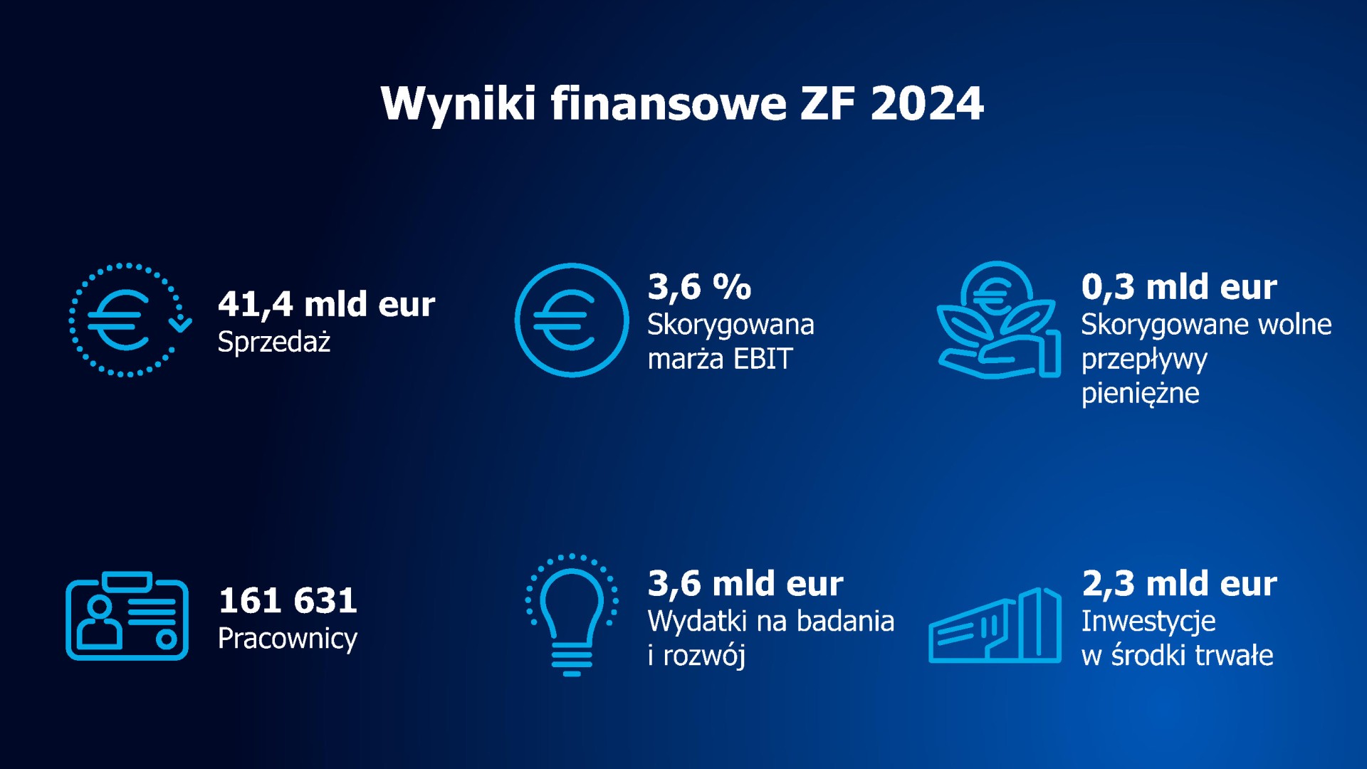 W 2024 roku firma ZF osiągnęła sprzedaż na poziomie 41,4 mld EUR, zatrudniając na całym świecie około 161 600 pracowników. Firma posiada 161 zakładów produkcyjnych w 30 krajach.