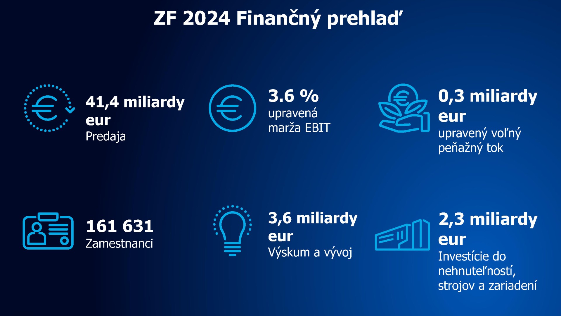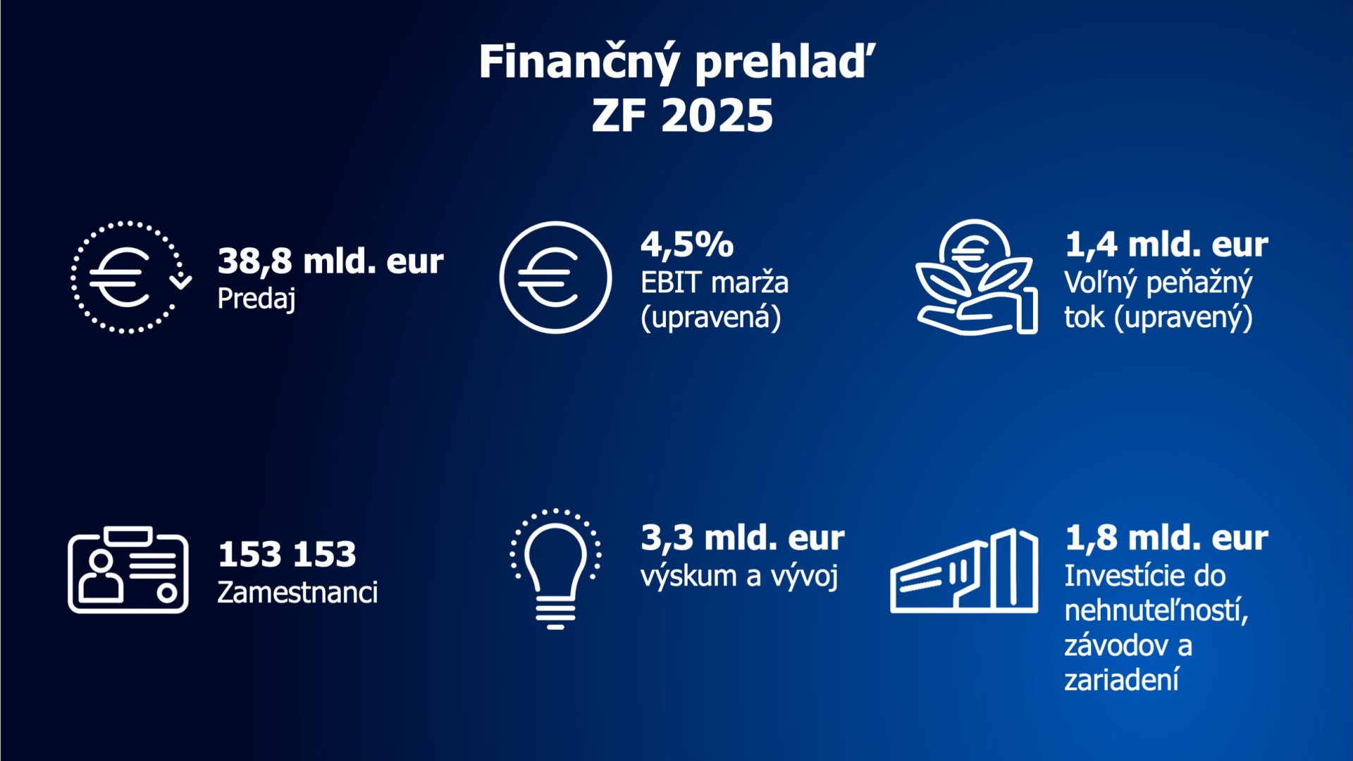 Spoločnosť ZF je technologický koncern s celosvetovou pôsobnosťou. Spoločnosť dodáva špičkové výrobky a systémy pre mobilitu osobných a úžitkových vozidiel, ako aj priemyselné technológie. Prostredníctvom rozsiahleho výrobného programu zásobuje spoločnosť ZF predovšetkým automobilových výrobcov, firmy zaoberajúce sa mobilitou a novovzniknuté podniky v oblasti prepravy a mobility. Spoločnosť ZF elektrifikuje vozidlá rôznych kategórií a svojimi výrobkami prispieva k znižovaniu emisií, ochrane klímy, ako aj k zvyšovaniu bezpečnosti mobility. Okrem automobilového sektora osobných a úžitkových vozidiel pôsobí spoločnosť ZF aj v segmentoch trhu, ako sú stavebné a poľnohospodárske stroje, veterná energia, lodná doprava, železničná technika a testovacie systémy.