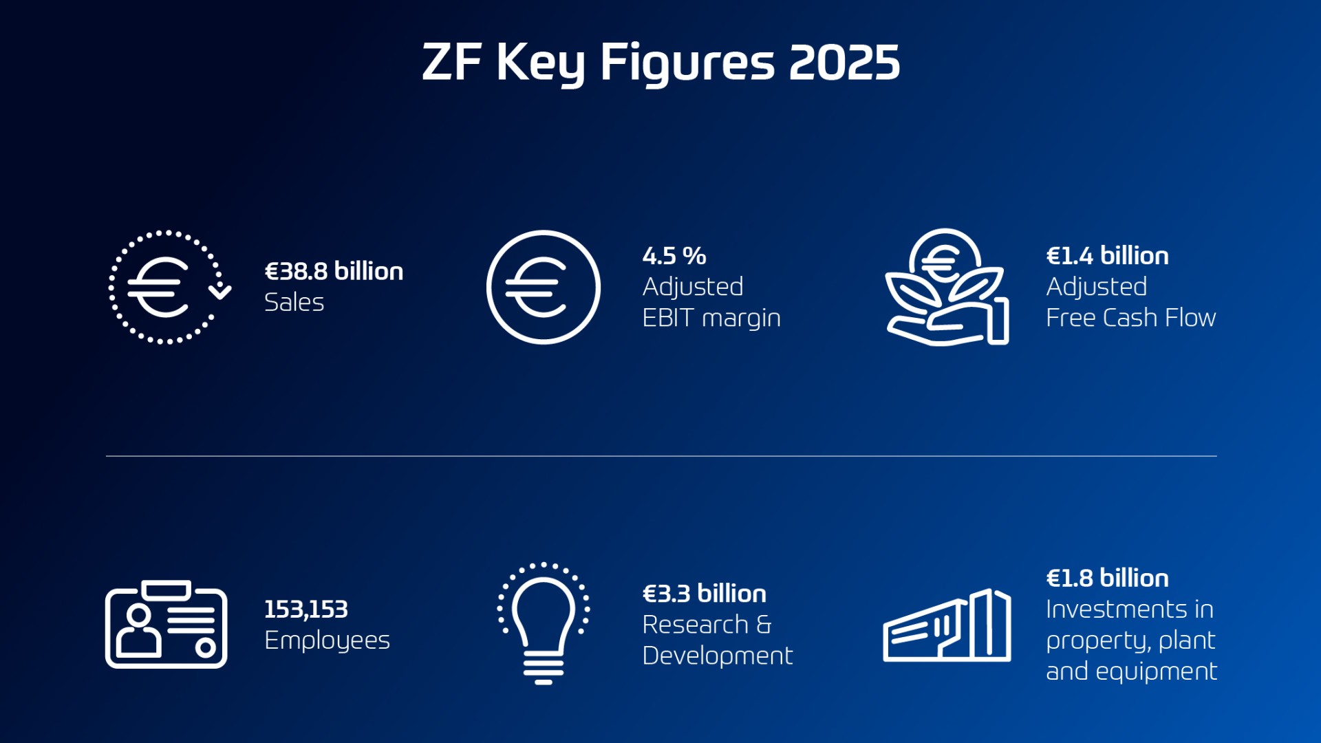 Dünya çapında yaklaşık 153.000 çalışanıyla ZF, 2025 mali yılında 38,8 milyar Euro'luk satış gerçekleştirdi. Şirketin 29 ülkede 162 üretim tesisi bulunuyor.
