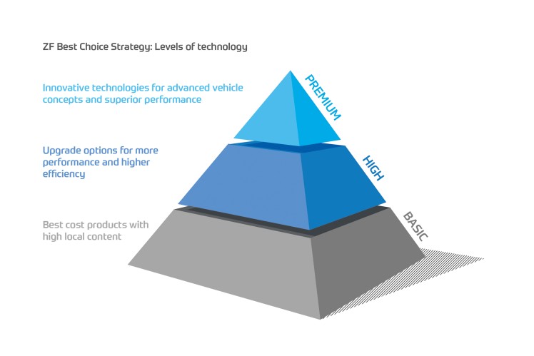 采埃孚理想的选择策略: 三个技术层级覆盖了所有对技术和经济性需求的应用范围。